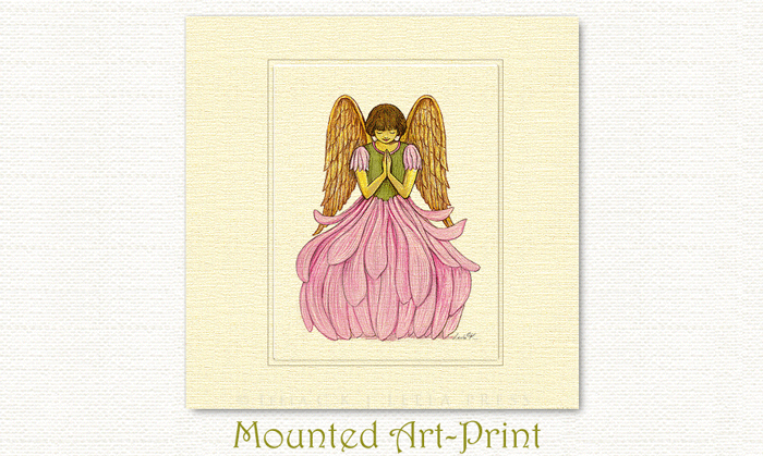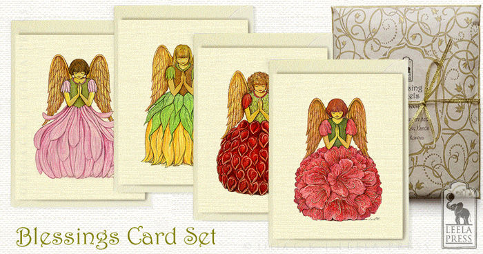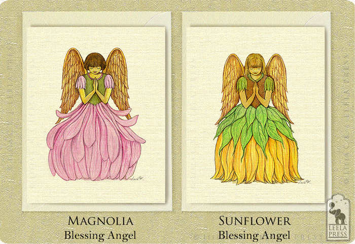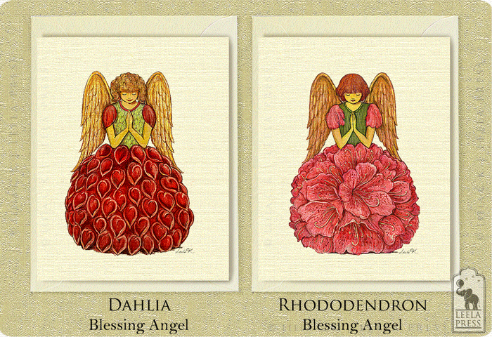 Ivory Silkweave Luxury Cards and Art-prints, printed with four Blessing Angels in archival inks, hand-embellished with shimmering gold and silver highlights. Each offers blessings in line with the floriographical symbolism of their flower.