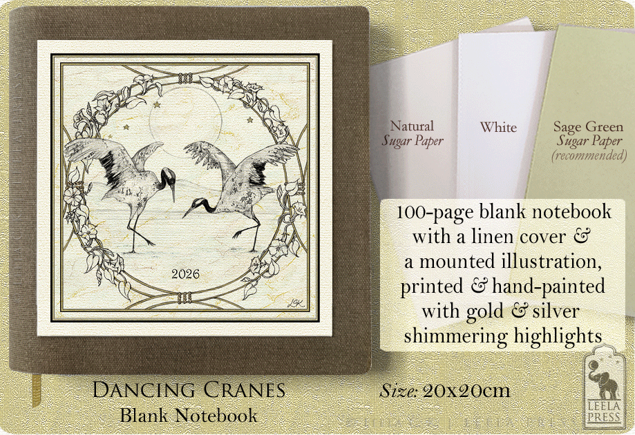 50 leaves (100 pages) are stitched along the spine with gold thread and folded over in this notebook with an illustration of Cranes dancing in the moonlight, on its cover. The artwork is printed onto ivory silkweave card and hand-embellished with gold and silver shimmering highlights. Comes with a matching gift card.