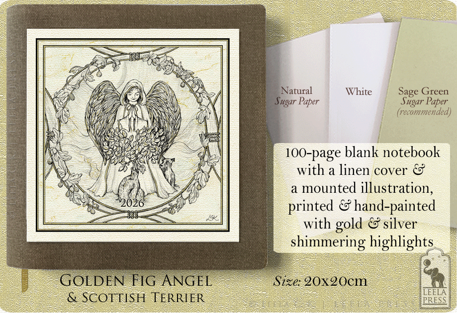 50 leaves (100 pages) are stitched along the spine with gold thread and folded over in this notebook with an illustration of a Golden Fig Angel, standing before a ginseng fig tree, with golden hanging figs around her and a faithful Scottish Terrier by her side on its cover. The artwork is printed onto ivory silkweave card and hand-embellished with gold and silver shimmering highlights. Comes with a blessing gift card.