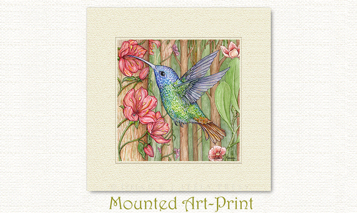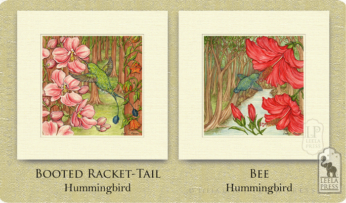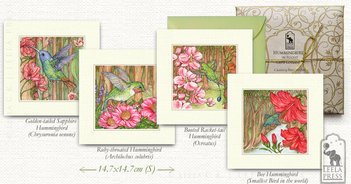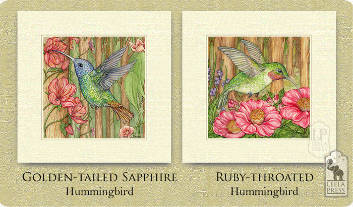 Ivory Silkweave Luxury Cards and Art-prints, printed with four hummingbird species in archival inks, hand-embellished with shimmering gold and silver highlights.