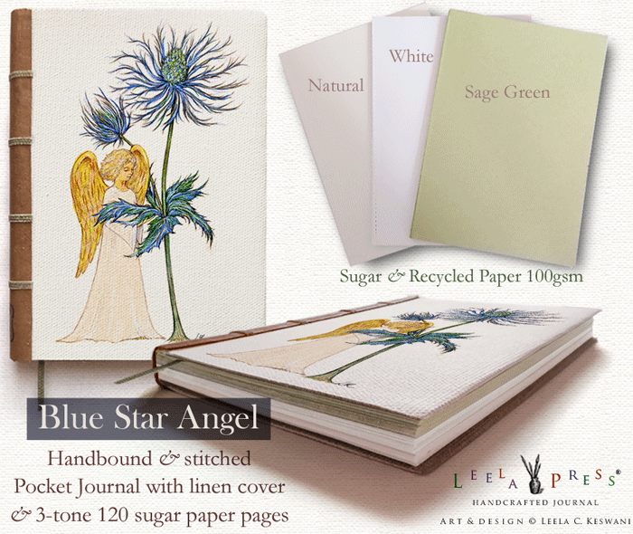 Handcrafted Pocket Journal (11x15cm) with canvas linen cover; 120 blank, unlined pages, in 3 tones, handstitched; decorative ribbed spine; and back pocket