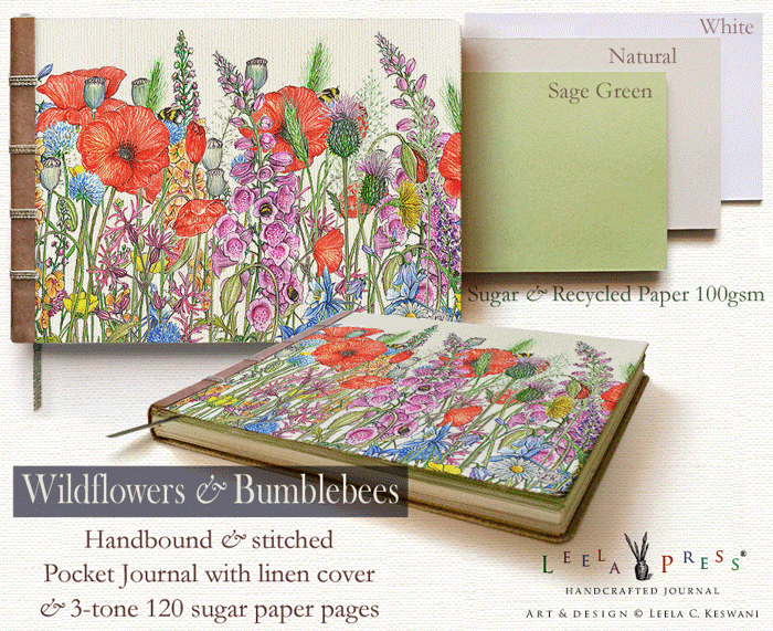 'Wildflowers & Bumblebees' Handcrafted Pocket Journal (11x15cm) with canvas linen cover; 120 blank, unlined pages, in 3 tones, handstitched; decorative ribbed spine; and back pocket