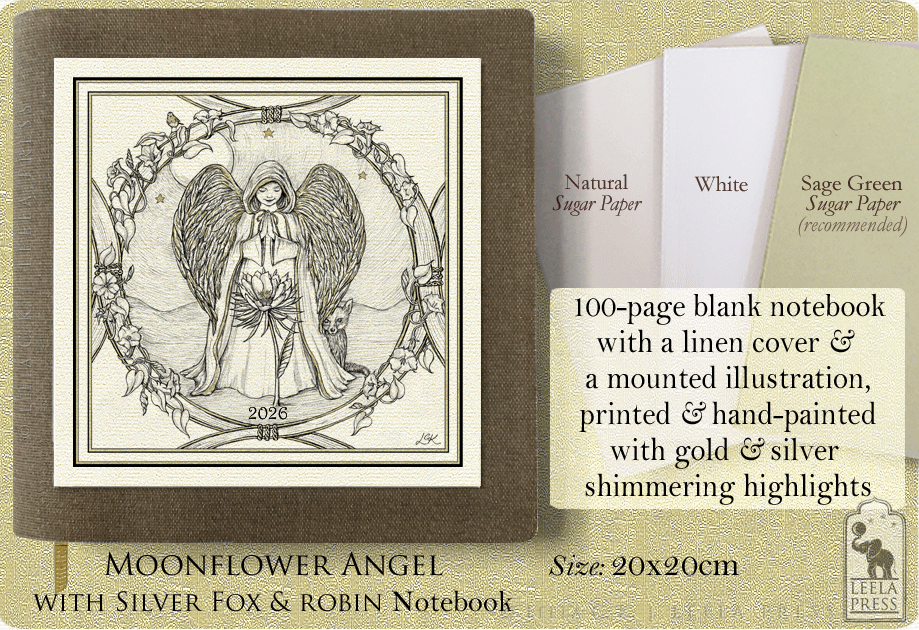 50 leaves (100 pages) are stitched along the spine with gold thread and folded over in this notebook with an illustration of a Moonflower Angel and a Silver Fox by her side and a robin above, on its cover. The artwork is printed onto ivory silkweave card and hand-embellished with gold and silver shimmering highlights. Comes with a blessing gift card.